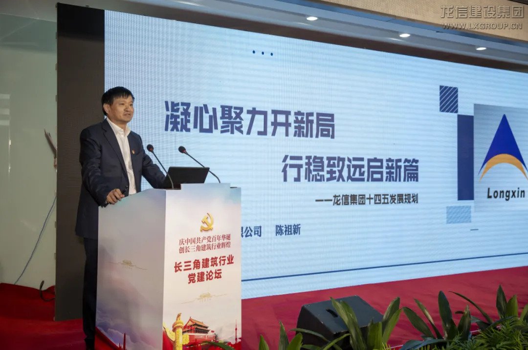 儀式上,龍信集團(tuán)黨委書記、董事長陳祖新致辭,他表示,龍信集團(tuán)始終堅持以黨建為統(tǒng)領(lǐng)推動企業(yè)高質(zhì)量發(fā)展。十九屆五中全會審議通過的“十四五規(guī)劃”和二〇三五年遠(yuǎn)景目標(biāo)為中國建筑業(yè)的發(fā)展指明了新的發(fā)展方向,龍信集團(tuán)將堅定不移貫徹新發(fā)展理念,以科技創(chuàng)新為驅(qū)動,依托國家博士后科研工作站、龍信發(fā)展研究院等平臺,在創(chuàng)新中求突破,積極推動綠色建筑、智慧建筑發(fā)展,積極構(gòu)建新時期企業(yè)發(fā)展新格局。