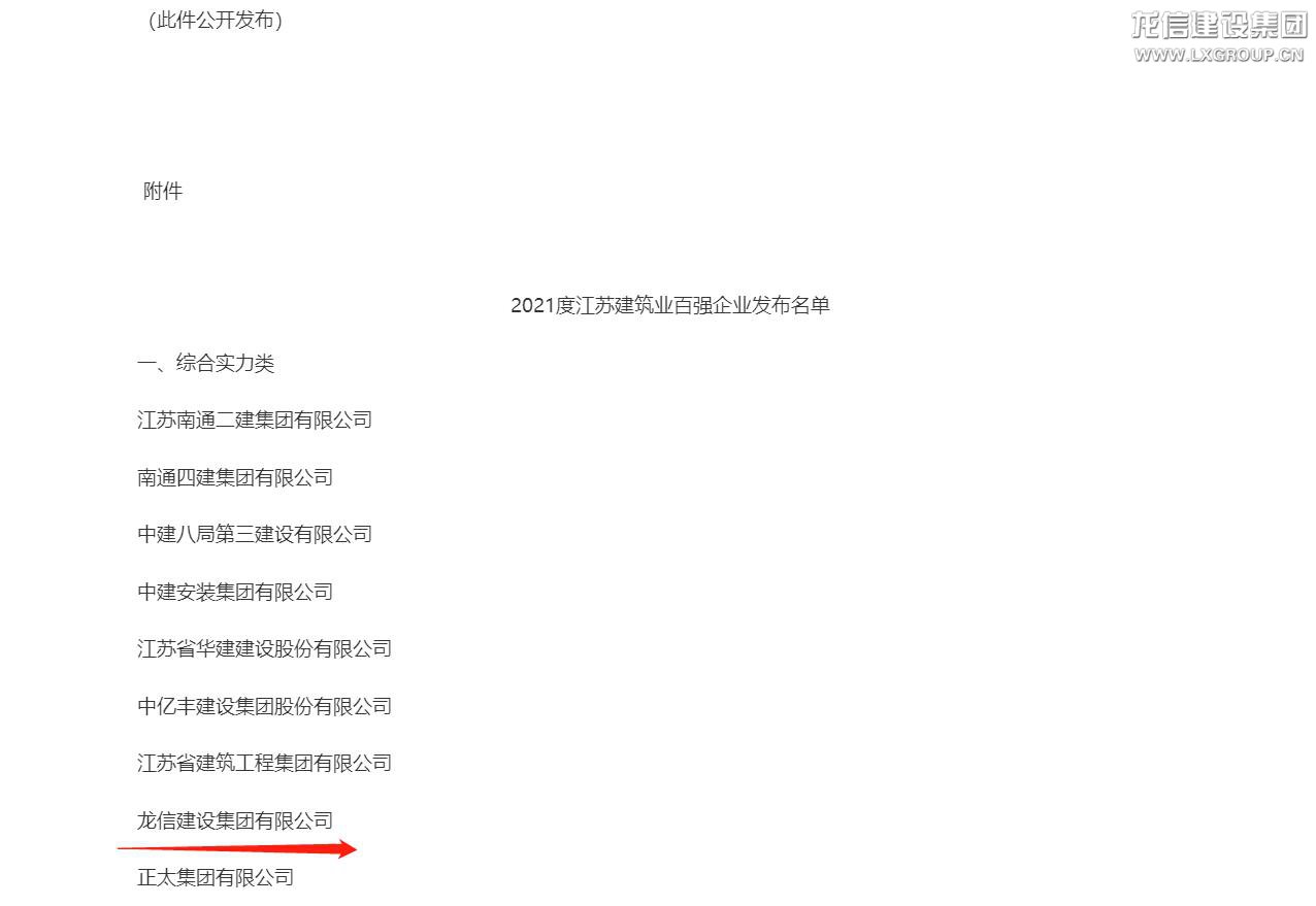 近日,江蘇省住房和城鄉建設廳、省統計局、省商務廳聯合公布了2021年度江蘇省建筑業百強企業名單。龍信建設集團有限公司榮列綜合實力類第八位,建筑外經類第五位,充分展現了集團綜合實力和品牌影響力。