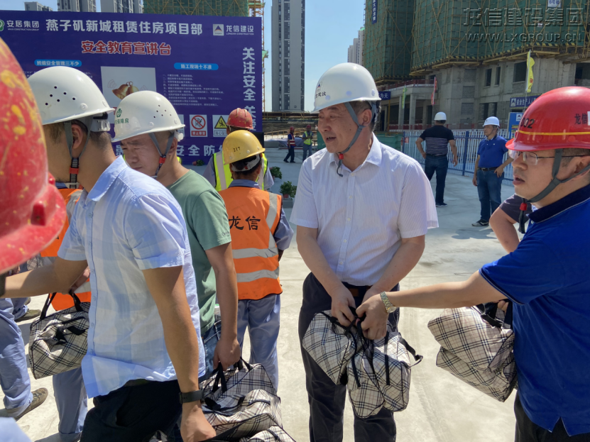 8月15日上午,南京市委副書記、市長韓立明一行來到南京市燕子磯新城租賃住房項目考察調研及向一線工人進行慰問。南京安居集團黨委書記、董事長毛龍泉,副總經理劉建石,南京安江置業法人代表郁露,南京燕子磯新城建設指揮部負責人周華山,南京蘇寧建設工程咨詢有限公司董事長蔣溶泉,龍信建設集團黨委書記、董事長陳祖新,副總經理江建明一行共同接待。